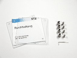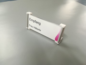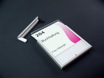 Zum Wechseln der Beschriftung öffnet man eine Leiste oder die Endstücke und nimmt die PMMA-Platte mit der Beschriftungseinlage heraus.