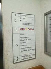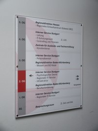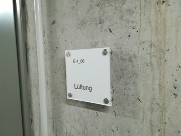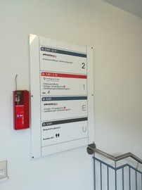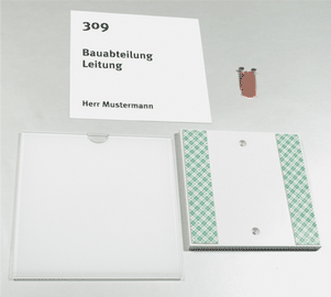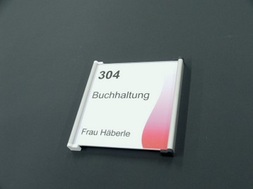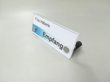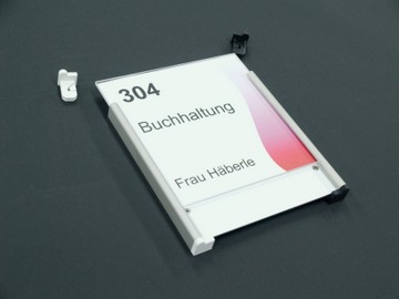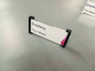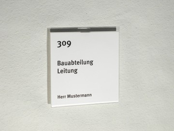 Schilder mit Edelstahlhalterungen sind als Sebstbeschriftungsschilder gedacht. Hier sind Größe und Ausführung frei wählbar. Zwei PMMA-Platten bilden die Halteelemente für die Beschriftung mit Einlegefolien, die mit Edelstahlhalterungen an der Wand befestigt werden.
