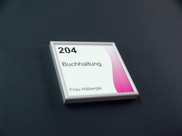 Schilder mit Aluprofil sind auch als Sebstbeschriftungsschilder gedacht. Auch hier sind Größe und Ausführung frei wählbar. Die Aluprofile werden mit einer Aluplatte fest verbunden (an 2 oder 3 Seiten). Die PMMA-Platte wird von oben oder seitlich mit der Beschriftung eingeschoben.
